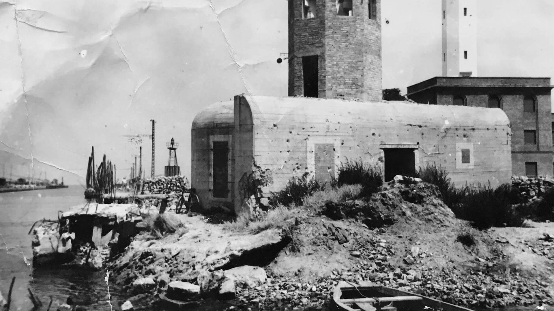 Le foto storiche dimostrano in questo punto l’esistenza di un bunker Regelbau 688 che costituiva parte del sistema difensivo del porto. Per mascherarne la presenza, sulle facciate, erano state dipinte delle finte porte e finestre. In sommità era stata aggiunta una postazione di tiro. in laterizi, probabilemnte con la speranza che fosse confusa con edifici civili.